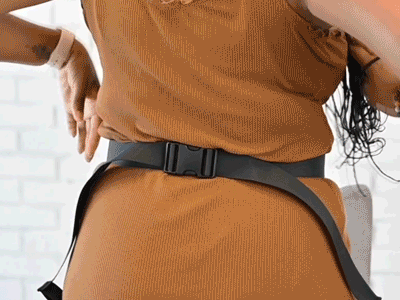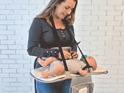Combination of padded straps and waist belt worn high and tight like a baby carrier to evenly distribute baby's weight and reduce any strain.
