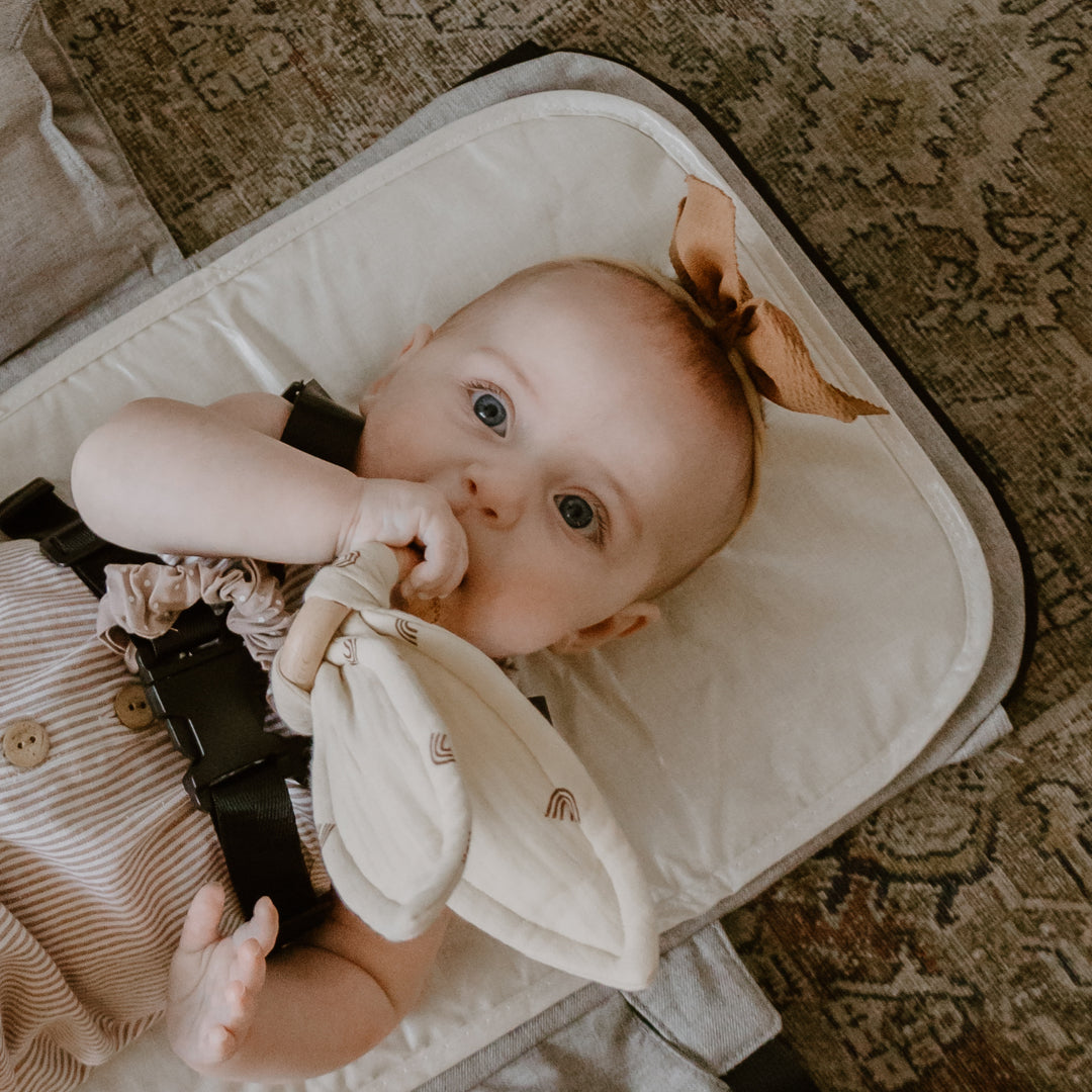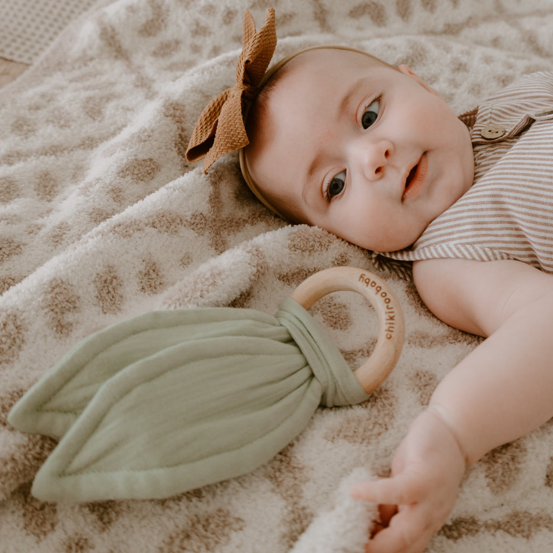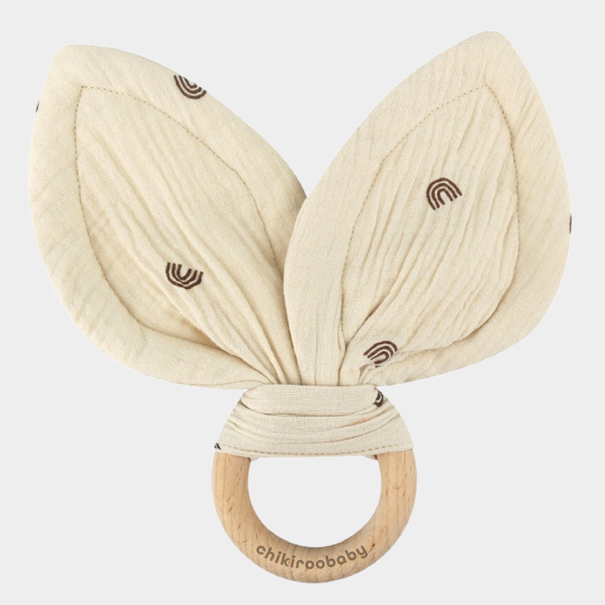 The soft crinkle fabric and smooth wooden ring provide multiple textures for the baby to chew and explore, helping to soothe sore gums and promote healthy tooth development. While the adorable crinkly kangaroo ears are specifically designed to delight babies and keep their minds engaged for an easier diaper change when using our Chikiroo Wearable Changing Station.